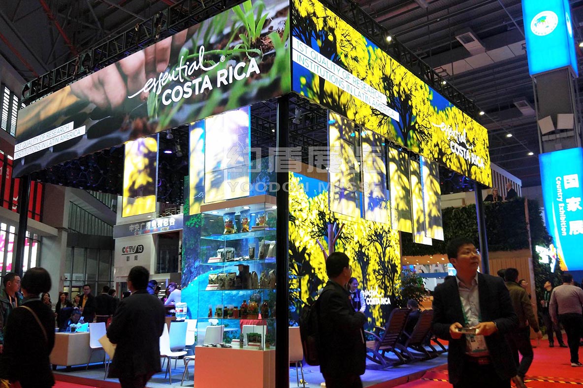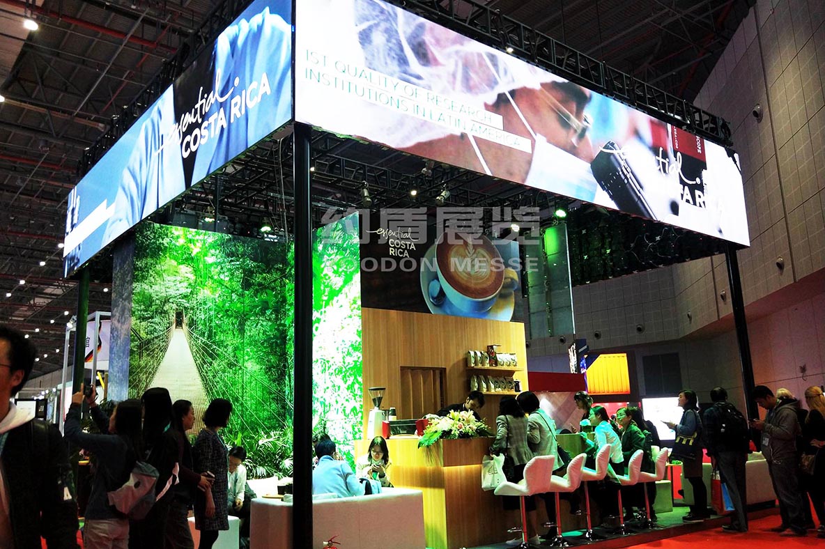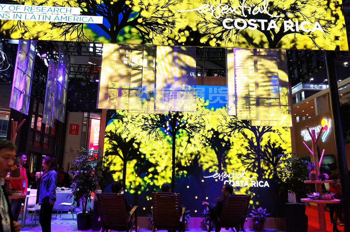 展臺(tái)的頂部我們選用了高清的P2.5 LED 屏幕,循環(huán)播放哥斯達(dá)黎加的自然風(fēng)情.全LED展示也是近來上海展會(huì)設(shè)計(jì)的一個(gè)潮流和風(fēng)尚.
